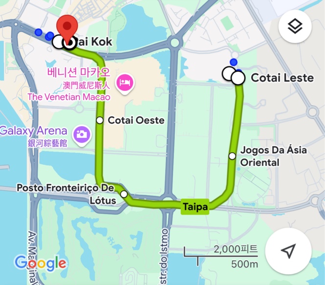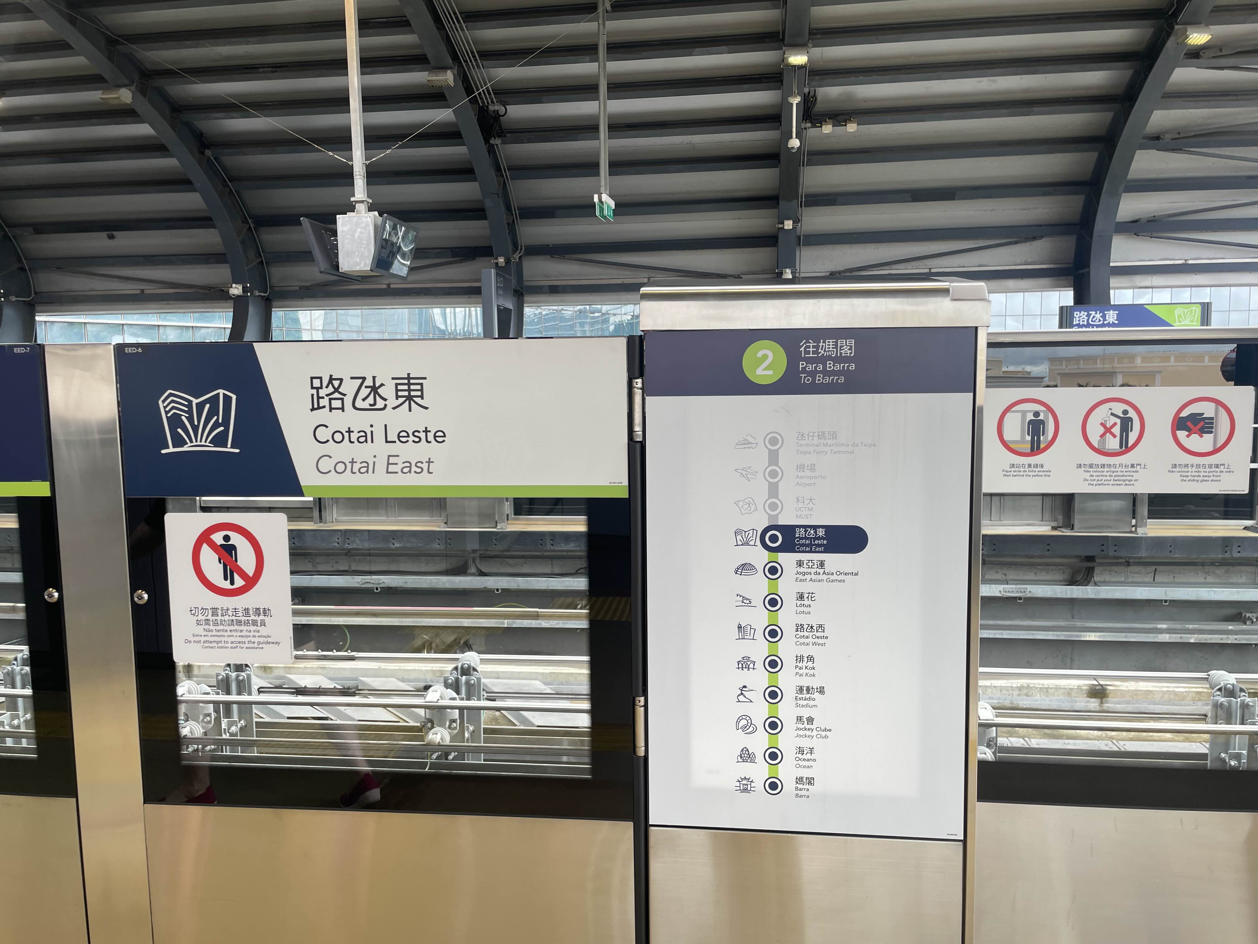 지금 있는 그랜드 하얏트 호텔 앞은 Cotai Leste역입니다. 저희 목적지는 타이파 빌리지로, 총 4개 정류장을 지나 Pai kok에서 내려요.